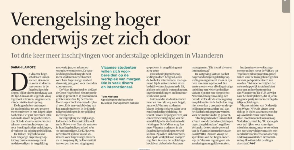 Op de voorpagina van De Tijd van 19 september jl. werd melding gemaakt van de voortschrijdende verengelsing van het hoger onderwijs in Vlaanderen. Zo werden aan onze universiteiten en hogescholen tot drie keer meer inschrijvingen voor anderstalige opleidingen opgetekend dan eerder het geval was.
